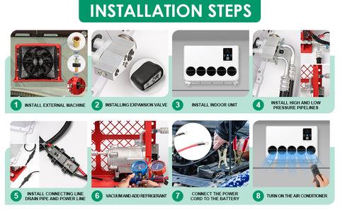 - DC Power: The DC electric air conditioner uses a high-efficiency electric scroll compressor and is powered by the vehicle battery. It keeps your cab cool even when the engine is off.Cooling capacity of 12000 BTU and an air volume of 600 m³/h, which can effectively adjust the temperature in your vehicle swiftly and efficiently.